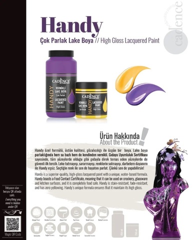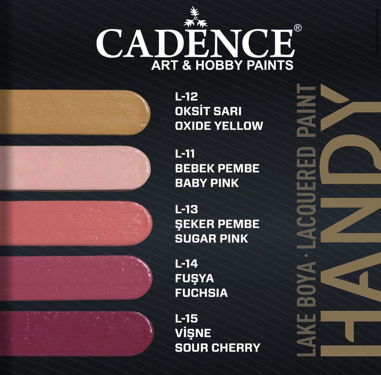 Для некоторых видов пластика может потребоваться грунтовка (грунтовка для пластика). Самовыравнивающаяся, не оставляет следов кисти, поэтому даже новичок может добиться результатов профессионала. Смешивая между собой различные цвета, можно получить богатую палитру оттенков окрашенной поверхности. Поскольку Cadence Handy Lake имеет прочную структуру и высокую укрывистость, достаточно нанесения одного-двух слоев. Время нанесения второго слоя в зависимости от температуры воздуха составляет от 3 до 6 часов, полное высыхание краски, нанесенной на поверхность, составляет от 6 до 12 часов. Окрашенную поверхность можно покрыть лаком, производитель рекомендует использовать Cadence Aqua Stone или Cadence Ultimate Glaze.