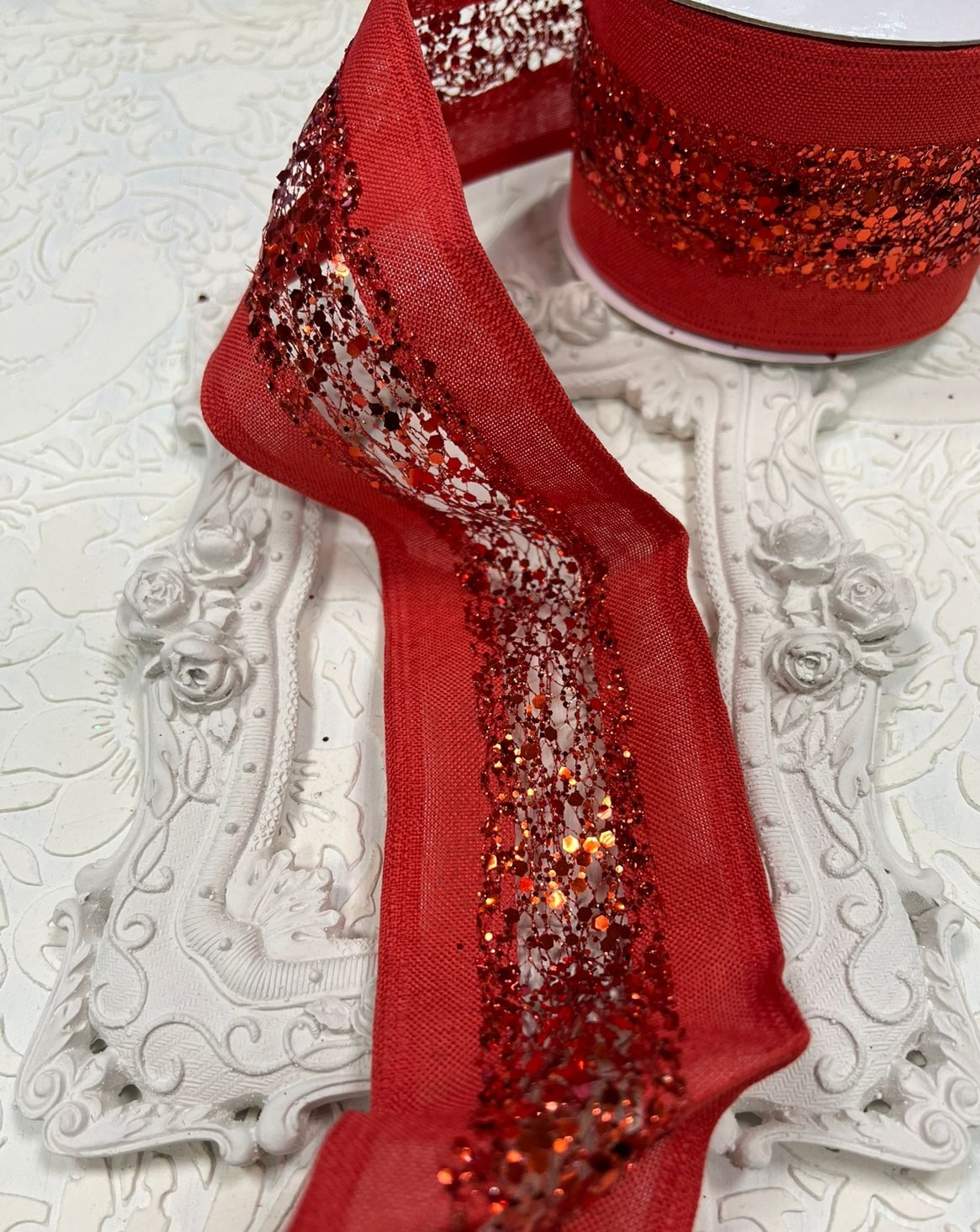 Лента с пайетками и с проволкой 6,5см цвет красный (1м)
