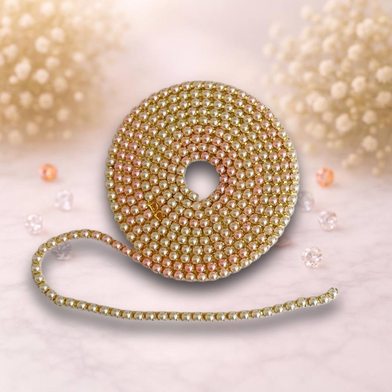стразовая лента с ярко розовой жемчуженой на золотом метале,1метр